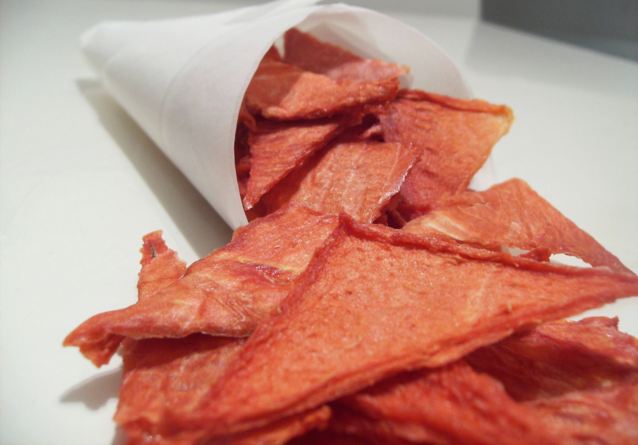 Wah ternyata buah semangka bisa juga dibuat menjadi keripik buah. Rasa aslinya semangka yang manis, akan tetep manis meski dibuat menjadi keripik buah.